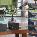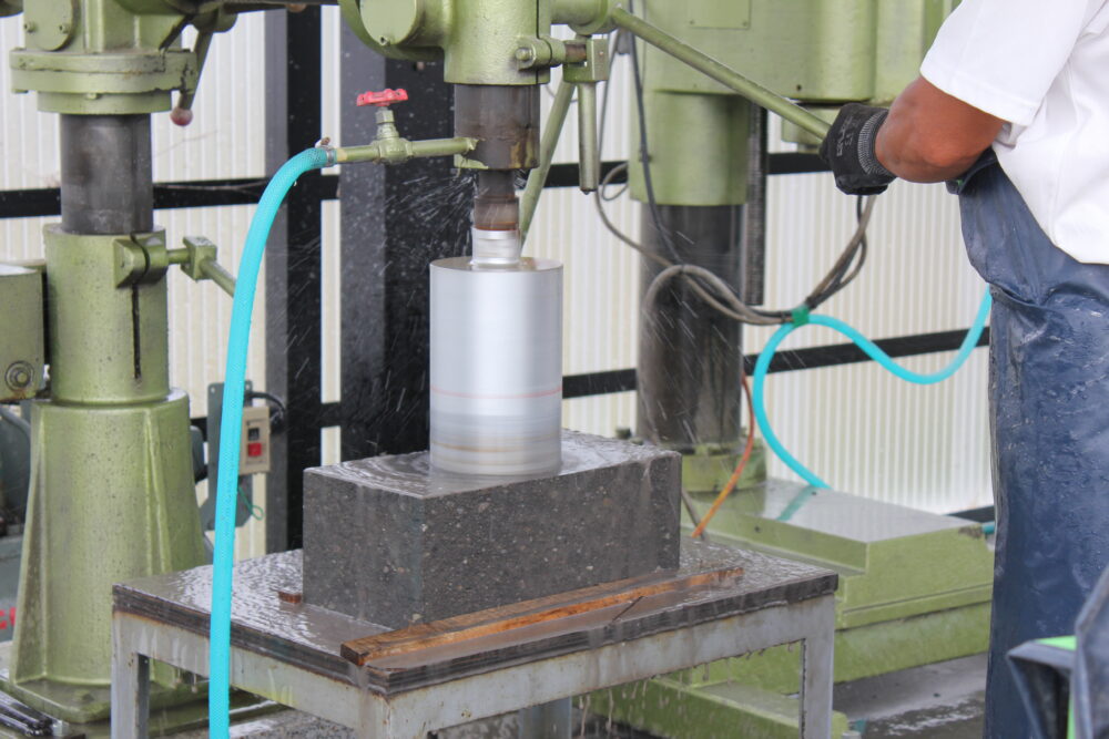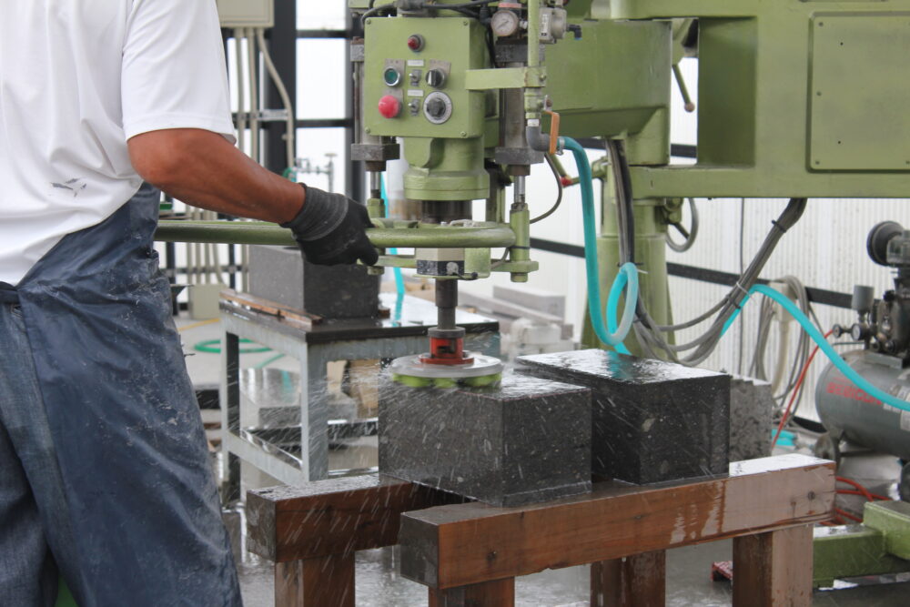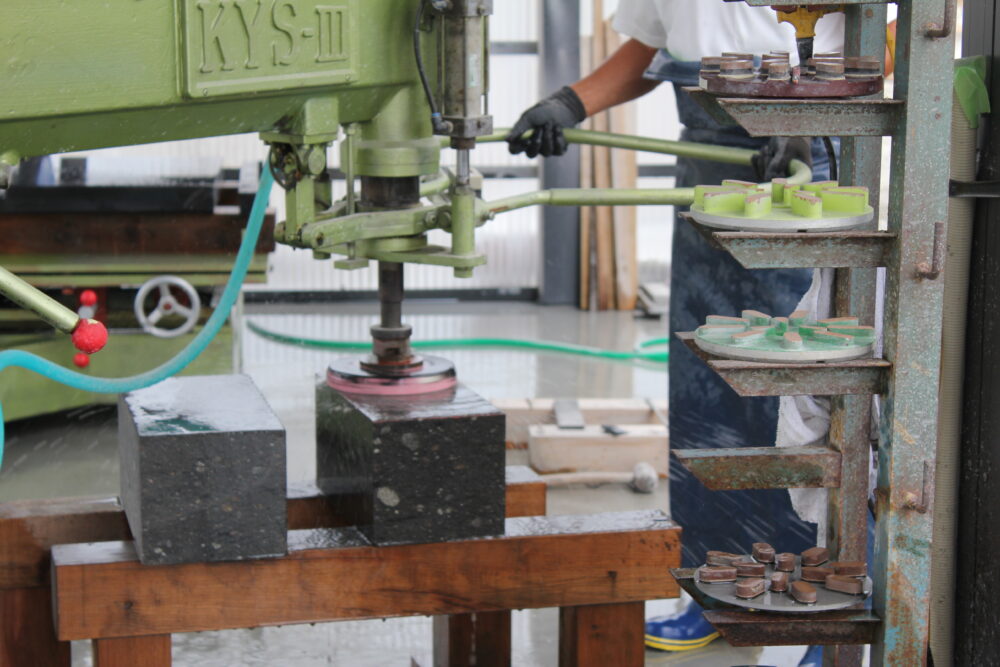 自社での加工 2021年10月8日2021年10月5日 自社作業場での、加工の様子です。 石にもそれぞれの性質があり、やわらかい・硬い・かけやすい・水を吸いやすい、そのため割れやすい、など加工のしやすい石、加工しにくい石があります。 職人がひとつひとつ石の特徴を見極めて、加工しています。 写真をクリックすると、大きくなります。 「石のカット作業」 「穴あけ作業」 「磨き作業」 砥石を取り替えて、つやを出します。