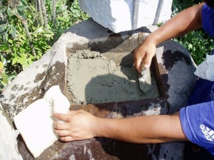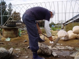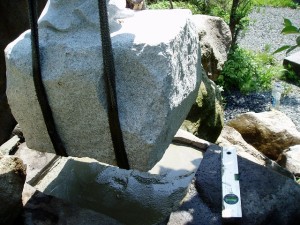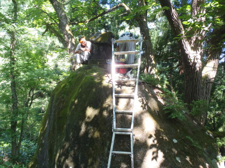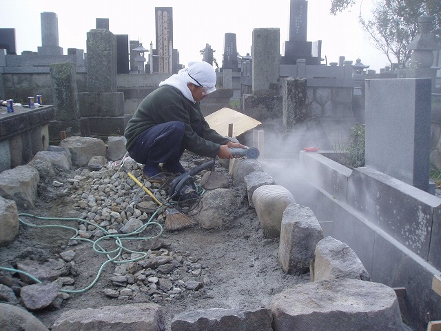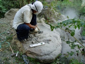作業スペースが広く取れないうえ、苔で滑りやすい石の上での作業。